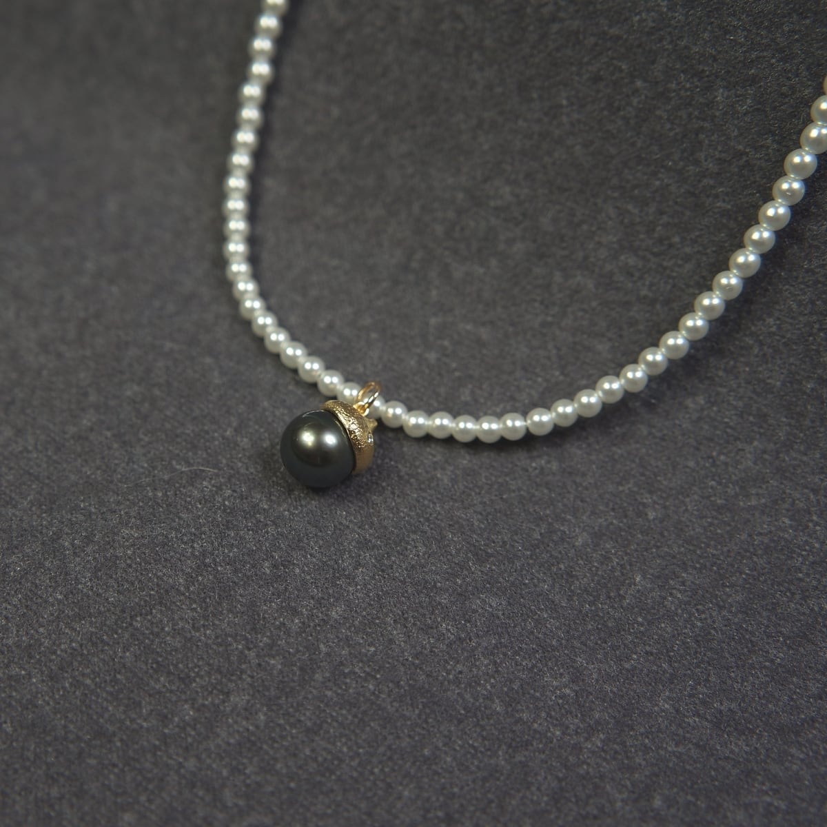 ナチュラルなフォルムが美しい 南洋ケシパール を使用し、キャップ部分には贅沢に K18ゴールド をあしらいました。さらに、小さな ダイヤモンド をアクセントに加えることで、胸元にさりげない輝きを添えています。